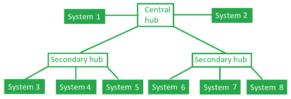 - 최상위 노드(central hub)에 장애가 발생하면 전체 시스템이 다운됩니다.